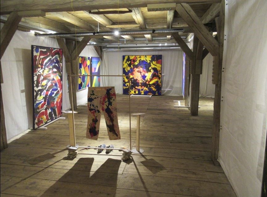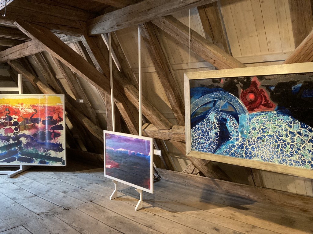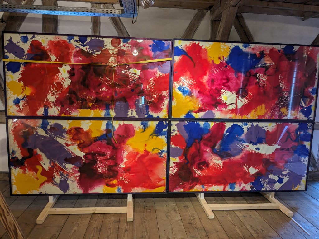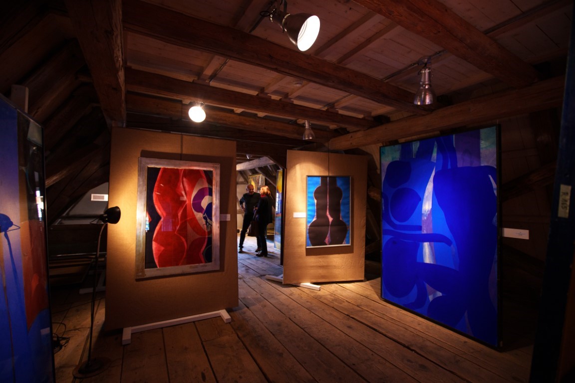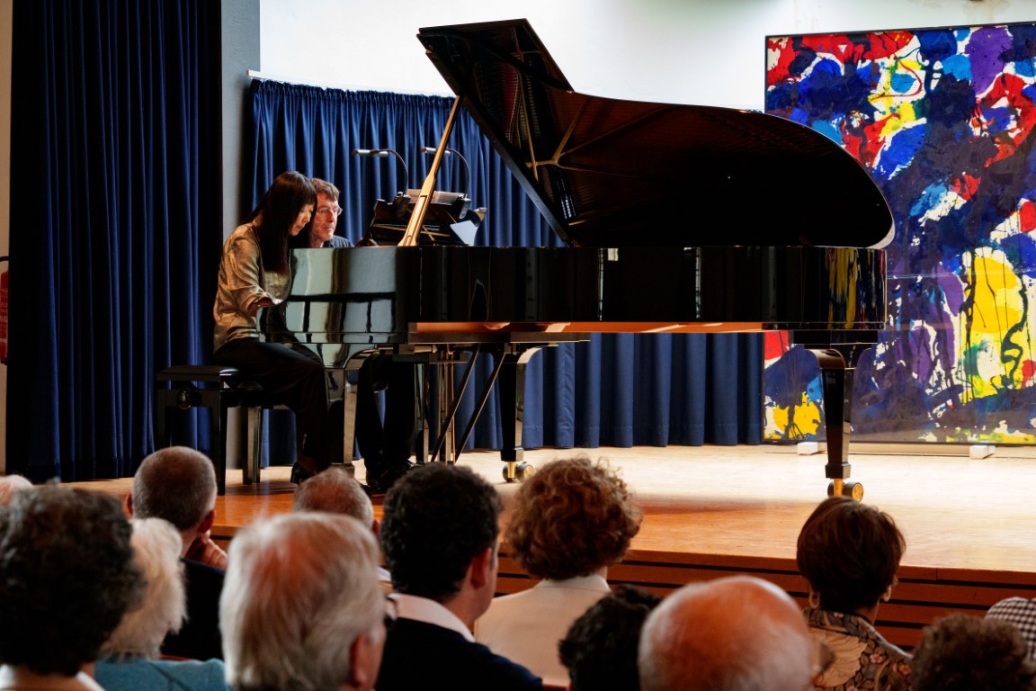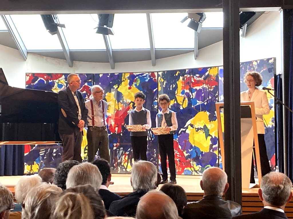 ![]() Musikalische Einlagen; Klavierduo Hayashizaki-Hagemann | ![]() Viererturm in der Eingangshalle | ![]() Für die Vernissage als Hintergrund aufgeklappt. Frau von Hirscheydt bedankt sich zusammen mit ihren Söhnen bei den Kuratoren |
