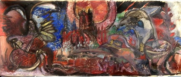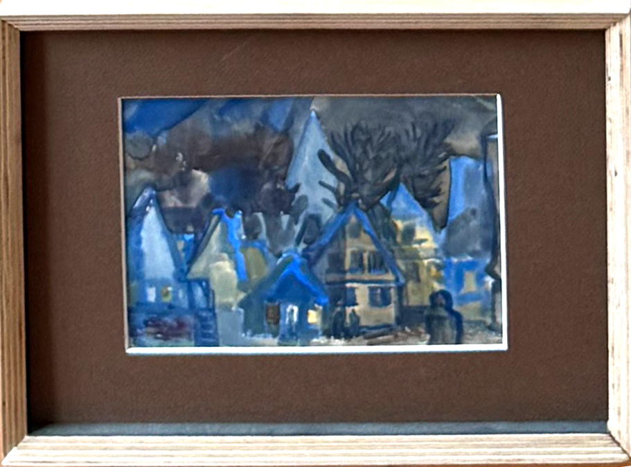 ![]() 1950er Öl 74x50, Canstatter Wasen ??ß | ![]() 1960er Aquarell, Gächinger Backhaus | ![]() 1963 75x38 Öl, Kathedrale mit cellospielendem Engel und Wasserspeier |